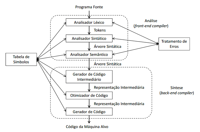 É importante destacar que esse estrutura dividida em seis fases é apenas uma representação didática e tem como objetivo demostrar como o compilador funciona, outras literaturas podem apresentar outros modelos com mais ou menos etapas.