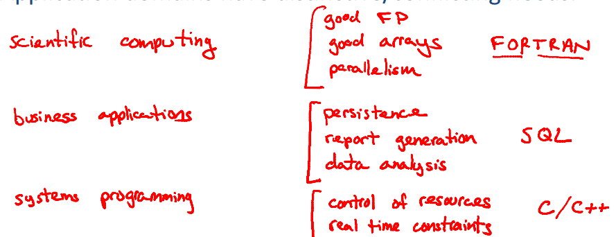 A criação de uma linguagem de programação depende do domínio da aplicação a que ela se propõe e isso também é um motivador para o surgimento de novas linguagens. Embora muitas tenham surgido com propósitos específicos, é comum uma linguagem ter muitas características e ser empregada em vários domínios de aplicação.