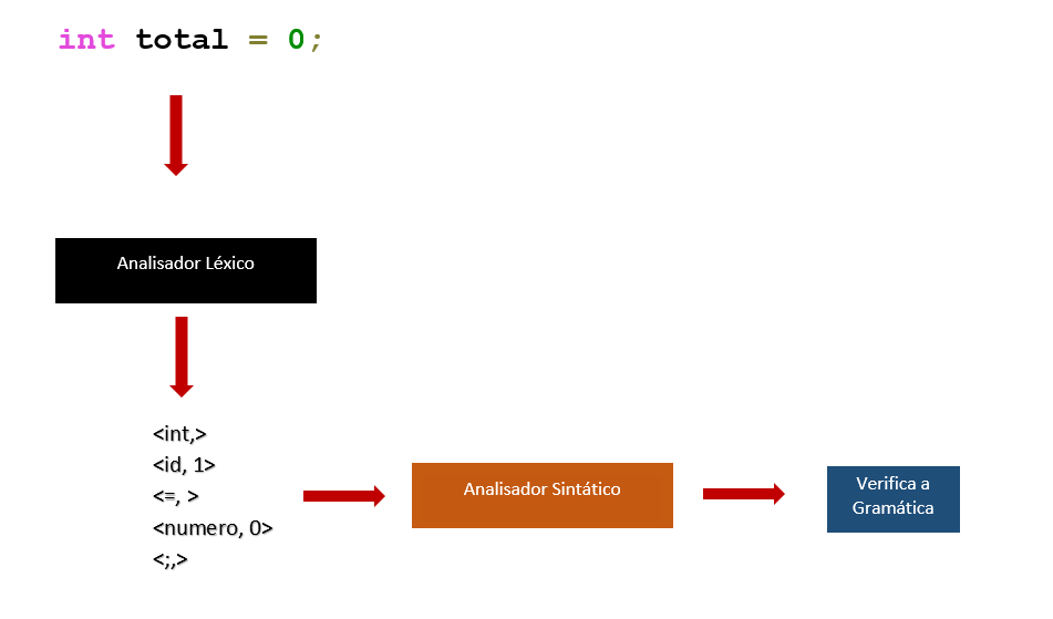 O processo de compilação inicia com o analisador léxico que varre todo o programa fonte e transforma o texto em um fluxo de tokens, e nessa fase é criada a tabela de símbolos. Logo em seguida vem a análise sintática que lê o fluxo de tokens e valida a estrutura do programa criando a árvore sintática. A terceira fase é a análise semântica que é responsável por garantir as regras semânticas. Todas essas fases fazem parte da tarefa de análise.